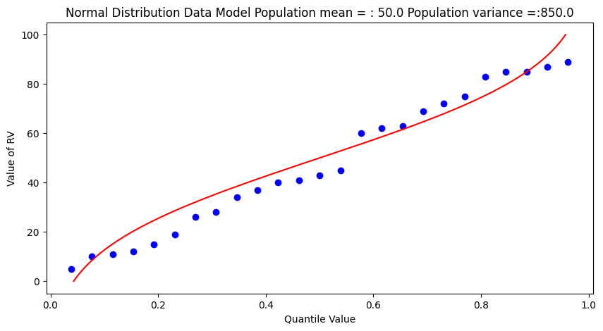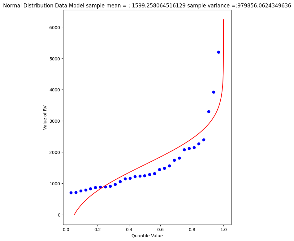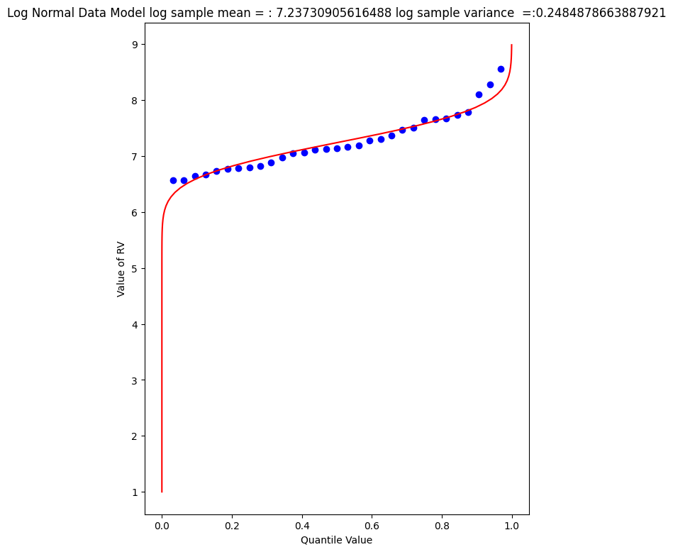 Now reverse transform back to native scale, and plot the sample values vs plotting position in blue, and the data model in red