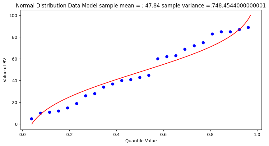 Now generate values for the data model (for plotting our red line “fit”), set limits to be a little beyond the sample range.