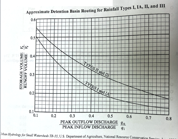 For a new development of 75 acres (0.117 \(~mi^2\)), the peak runoff for a 25-year storm of 360 cfs is to be limited to 180 cfs by use of a detention basin. The total runoff \(Q\) is 3.4 inches. Assume Type II rainfall. Using the TR55 Method and the figure below, the preliminary estimate of storage volume (ac-ft) is most nearly: