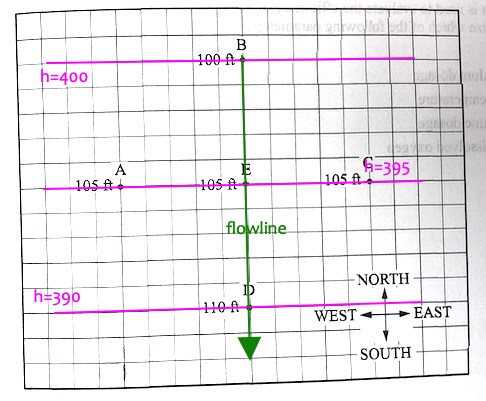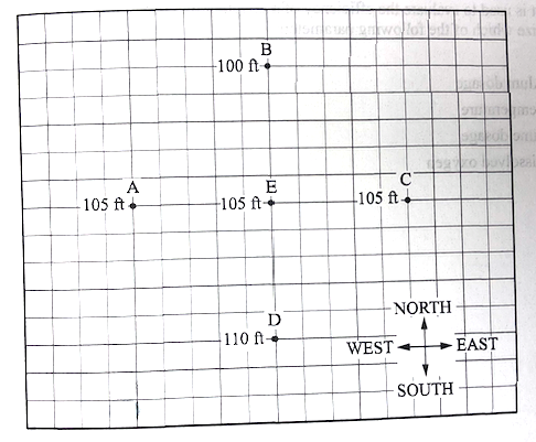 Four monitoring wells - A,B,C,and D - lie equidistant (200~ft) form a fifth well E. The depth to the water table is measured at each well and is shown below. The datum for the top of casing (TOC) for each well is equal to the five wells. Groundwater moves in which direction from point E?