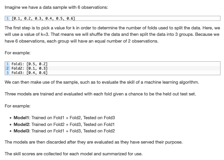 Importantly, each observation in the data sample is assigned to an individual group and stays in that group for the duration of the procedure. This means that each sample is given the opportunity to be used in the hold out set 1 time and used to train the model k-1 times.