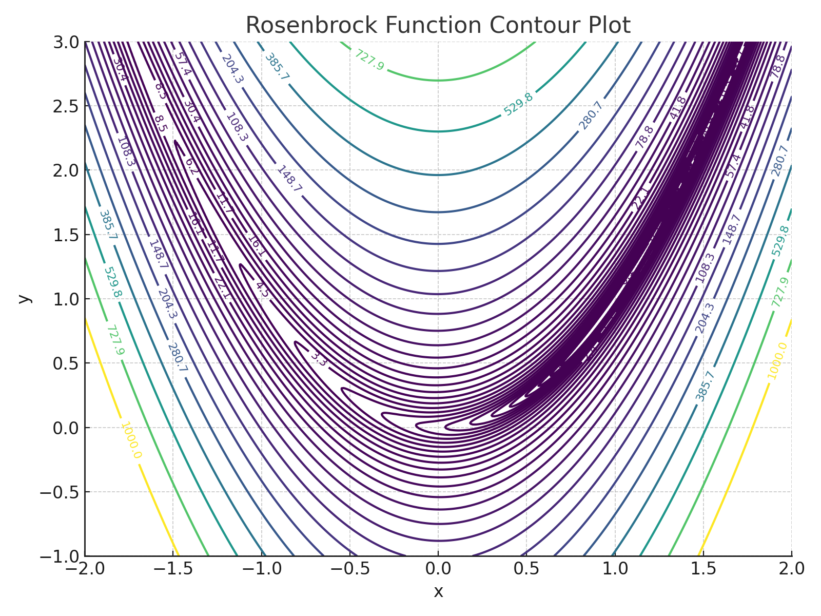 The Rosenbrock function, also known as the banana function, is a standard test case in optimization. Its curved, narrow valley challenges many optimization methods.