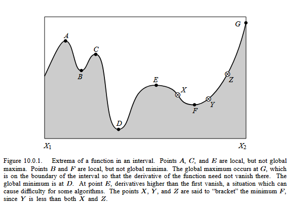 Optimization means finding either a ‘maximum’ or a ‘minimum’ of a function. The optimum value is typically defined over a range of interest. The figure below is taken from Press, William H.; Teukolsky, Saul A.; Vetterling, William T.; Flannery, Brian P. (1986). Numerical Recipes: The Art of Scientific Computing. 1ed. New York: Cambridge University Press. p. 388 ISBN 0-521-30811-9.